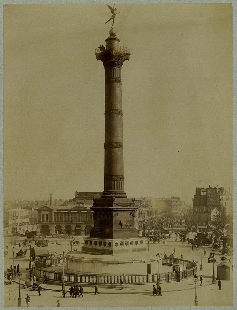 Meanwhile, Louis Philippe resumed the project of 1792 by erecting the famous Column of July in commemoration of the Revolt of 1830, that drove his cousin Charles X of power. It will be inaugurated in 1840. Both monuments coexisted few years before the Elephant, very poor, was demolished in 1846. From the fountain only remains today the base of the column.