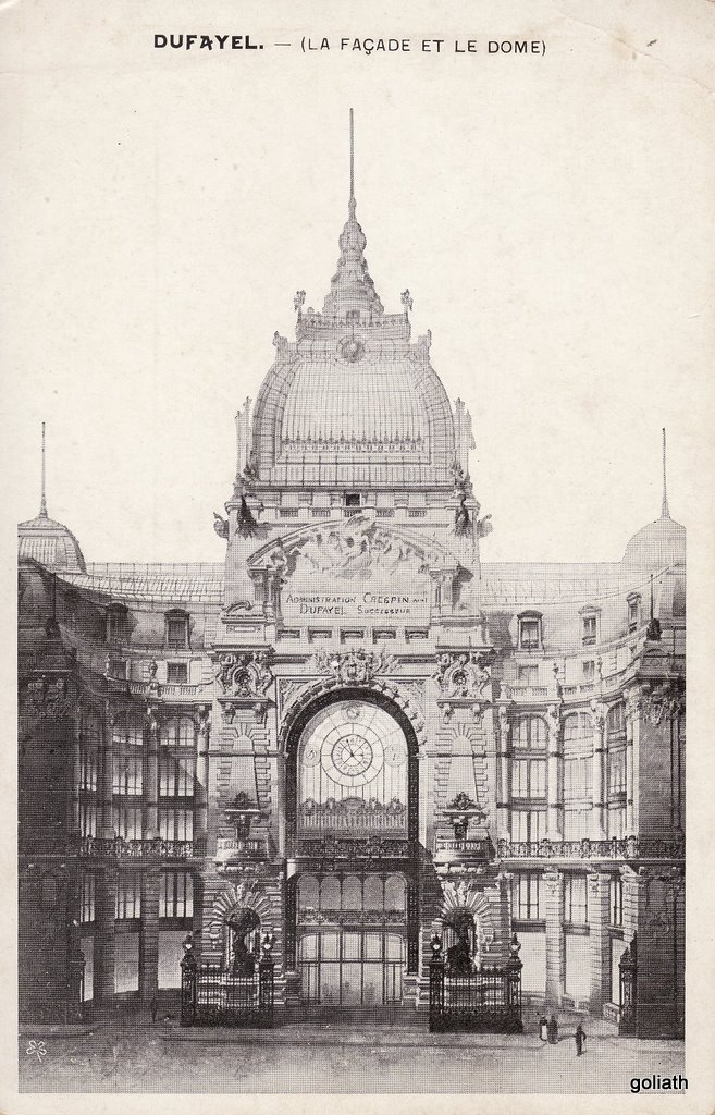 Entre 1874 et 1913, les galeries s’étendront progressivement au quadrilatère formé par le Boulevard Barbès, les rues Cristiani, de Sofia, et de Clignancourt, au numéro 26 de laquelle se dressait l’entrée monumentale. Celle ci était surmontée d’un dôme, lui même pourvu d’un phare éclairant la ville. Ces bâtiments nouveaux seront l’oeuvre des architectes Le Bègue (père et fils) ainsi que Gustave Rives. Quant au fronton, on reconnaîtra la pate de Jules Dalou et d’Alexandre Falguière. En 1912, 15.000 personnes travaillaient dans ce magasin qui se targuait alors d’être le plus grand du monde. Hélas, après avoir ouvert plus de 400 succursales, Dufayel se fourvoiera dans des placements hasardeux qui le conduisit à mettre fin à ses jours en 1916. Les galeries fermeront leurs portes en 1930.
