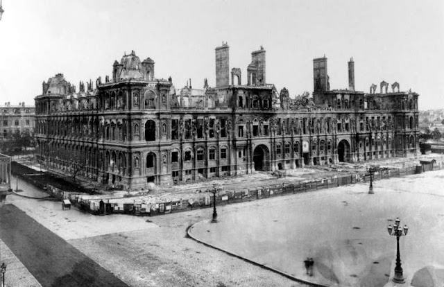 Achevé en 1628 sous le règne de Louis XIII, ce Palais fut un lieu politique important. Il abrita entre autres le Comité de Salut public entre 1792 et 1794, ainsi que le gouvernement provisoire de Lafayette après la chute de Charles X en 1830. Le 28 mars 1871, après la défaite de Napoléon III contre la Prusse, le peuple de Paris s’insurge contre le régime et envahit l’Hôtel de Ville. C’est le début de la Commune. Les insurgés en furent rapidement chassés. Cependant, durant la semaine sanglante (22-28 Mai), un certain nombres de monuments Parisiens seront délibérément incendiés par les Communards et en particulier tout ceux qui possédaient un rapport avec l’image du pouvoir. Ce fut le cas de l’Hôtel de Ville qui brûla le 24 Mai. Avec cet incendie, les archives et la bibliothèque de l’hôtel de ville partiront également en fumée. Les deux collections d’État civil parisien antérieures à 1860 seront également perdues à jamais: la première demeurait dans l’hôtel de ville et la deuxième dans le palais de justice (qui fut également incendié). Suite à cet incendie, l’Hôtel de Ville de Paris était détruit à un point tel que ses ruines ne pouvaient pas être utilisées pour la reconstruction. C’est donc un monument entièrement nouveau qui fut élevé de 1874 à 1882.