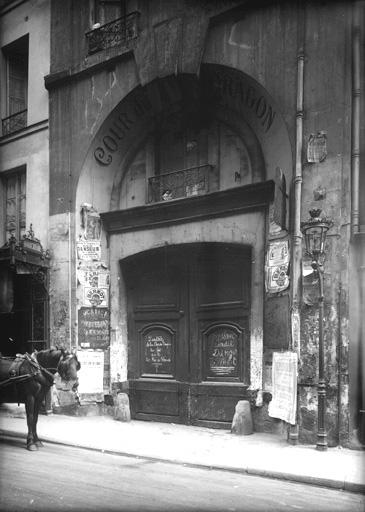 La Cour du Dragon, située au niveau de l’actuel 50/54 rue de Rennes, fut construite entre 1730 et 1735. Ce passage s’ouvrait alors depuis l’ancienne Rue de l’Egout face à la rue Sainte Marguerite (Gozlin). La seconde issue débouchant sur l’actuelle rue du Dragon ne fut percée que plus tard. L’endroit était célèbre pour son portail monumental surplombé par une statue du Dragon de Sainte Marguerite. La Cour abritait entre autre de nombreuses échoppes d’artisans métallurgistes, chaudronniers, plombiers et ferrailleurs.