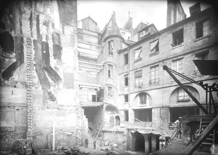 La Cour du Dragon résistera au percement de la Rue de Rennes en 1853 (voir article) et à l’élargissement du Boulevard Saint Germain en 1866. Elle deviendra une curiosité pour les parisiens de la fin du XIXe siècle friands d’un passé architectural gommé par les travaux Haussmanniens. Malgré un abandon progressif, La Cour abrite encore 80 familles en 1900. Son classement aux Monument Historique en 1920, n’empêchera pas sa démolition à partir de 1934. On tâchera tout de même de préserver le portail et la statue. Celle ci est hélas trop dégradée pour ne pas tomber en morceaux lors de l’opération de “démontage”.