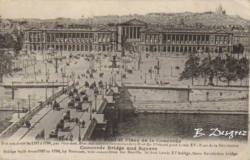 Le Pont de la Concorde fut construit entre 1787 et 1791. Cette oeuvre de Jean Rodolphe Perronet, d’abord baptisé Pont Louis XV, puis Pont de la Révolution, prendra son nom définitif durant la Révolution. La partie supérieure sera bâtie à l’aide de pierres récupérées de la Bastille. En 1810, Napoléon y fera poser douze statues de généraux… que Louis XVIII remplacera par celles de ministres, militaires et corsaires royaux. Les arches du pont supportant mal le poids de l’ensemble, Louis Philippe mettra tout le monde d’accord en transférant les oeuvres à Versailles.