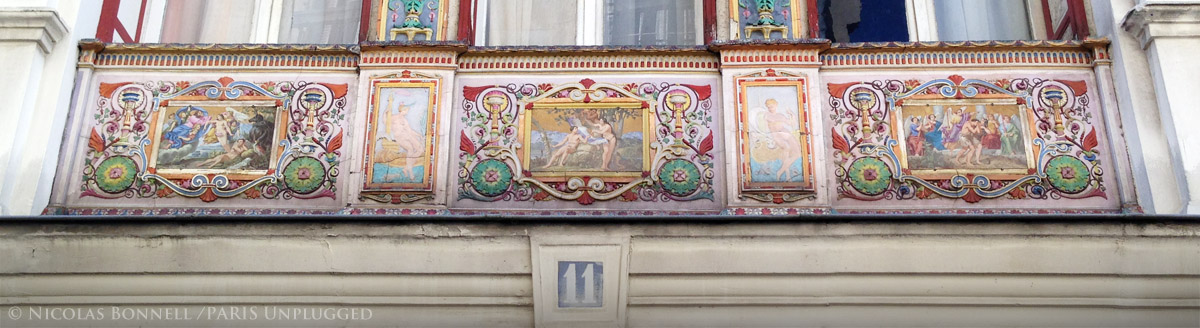 La rue recèle de nombreuses curiosités architecturales. Au numéro 11, on retiendra cette maison polychrome construite par l’architecte Anatole Jal, spécialiste de la peinture émaillée sur lave cuite. Le détail de la facade nous présente diverses scènes bibliques dont les acteurs apparaissent dans le plus simple appareil. Ces céramiques sont issues d’un projet du peintre Jollivet destiné à l’église Saint Vincent de Paul. L’oeuvre jugée scandaleuse, sera refusée. L’artiste recyclera donc son concept sur le porche de cette maison qu’il habita.