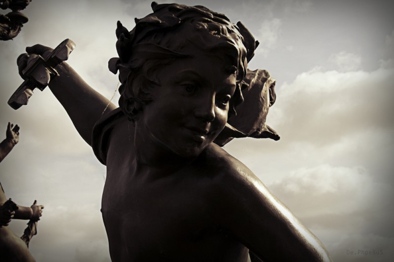 - Right bank, downstream: Pegasus held aloft by War, by Leóplold Steiner (after whose death in 1899 the ensemble was finished by Eugène Gantzlin).