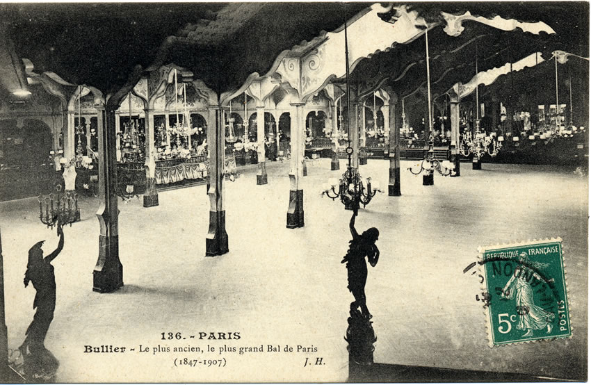 In 1850, after several expansions, the Bal Bullier began to offer several activities: billiard, bowling, walks, swings… It became increasingly popular because of the entertainment but also for its competitive prices. People danced the Mazurka, the Scottish, the Waltz, the Quadrille. Many celebrities went there: Apollinaire, Delaunay’s, Celeste Mogador. It was requisitioned twice during the wars of 1870 and 1914. Between the two wars the standard of the ball dropped and left more room for prostitution. The ball was reopened in 1920 but had to compete with “Magic City” and “Luna Park” (see article). It was subsequently converted into a tango and jazz bar.