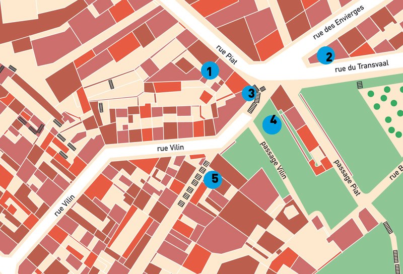 Ouverte en 1846, la rue Vilin était une voie de Ménilmontant totalement disparue aujourd’hui. Petite rue atypique, son parcours sinueux commençait rue des Couronnnes et s’achevait par un escalier débouchant rue Piat.