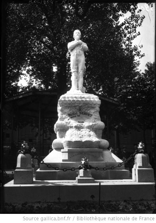 Michel Servet était un théologien et médecin espagnol né en 1511. On lui doit entre autre la redécouverte de la mécanique par laquelle le sang s’oxygène grâce aux poumons. Partisan d’un protestantisme sans consession, il refusera le dogme de la Saint Trinité. Cette prise de position le verra porté au bûcher par les protestants pour hérésie en 1553. En 1908, une statue fut installée en son honneur Square de l’Aspirant Dunand. L’oeuvre, commandée au sculpteur Baffier portait sur son socle, la phrase “A Michel Servet, brûlé vif par ordre de Calvin”. Ces quelques lignes témoignent d’un règlement de compte contre le politicien protestant Theodore Steeg de la part de ses adversaires.